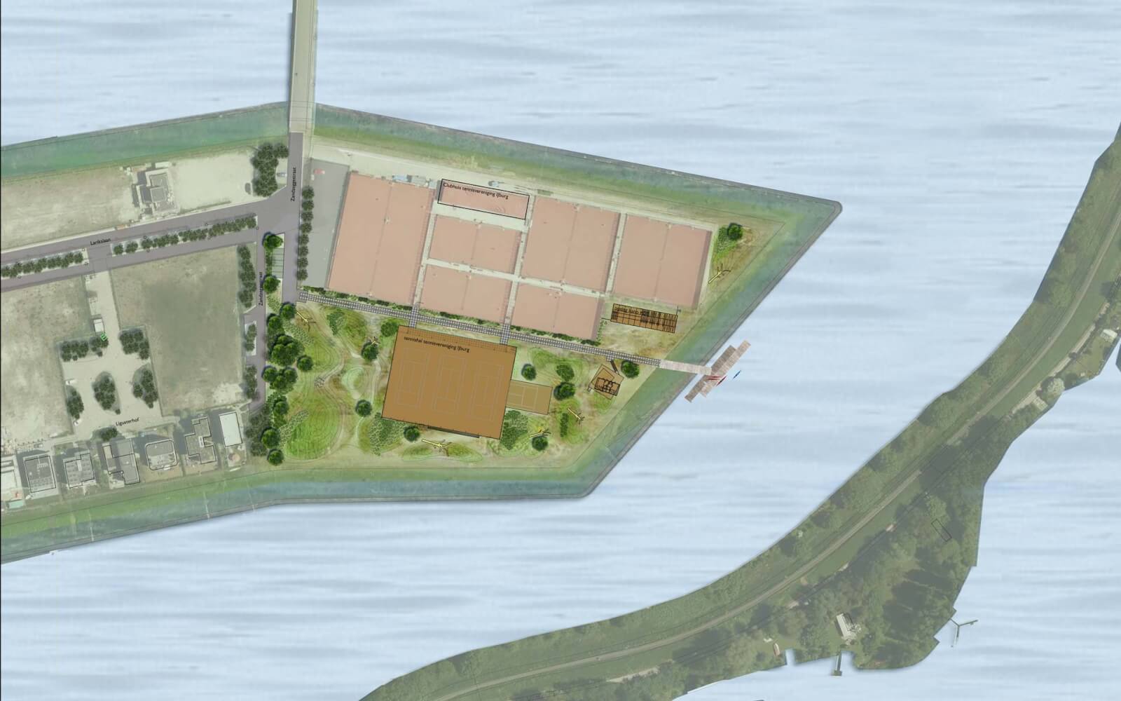 Uitgangspunt van het plan is een beplantingsbeeld dat aansluit bij een zandig (binnen)duinlandschap typologie met inheemse soorten op een geaccidenteerd terrein. Het gehele terrein wordt ingezaaid met verschillende grasmengsels. Op strategische plekken zijn heestergroepen met brem, meidoorn, vuurdoorn, gaspeldoorn gedacht om zo plekken te accentueren, windbescherming, en verzachting van de tennishal. Qua boomsoorten worden er populier, eik, den toegepast merendeel in meerstammige vorm. Naast inheemse struiken en de verschillende bloemrijke grasmengsels ontstaan door de hoogtes verschillende gradiënten en daarmee verschillende natuurlijke biotopen. Ten behoeve van de oeverzwaluw en het ijsvogeltje is een drijvend . ‘vogelbroedlodge’ ontworpen waar nestgelegenheid is voor de oeverzwaluw en het ijsvogeltje.